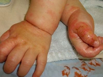 奶癣手上轻微红肿有许多黄色鳞屑图