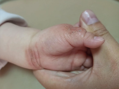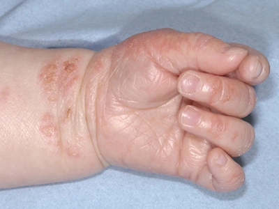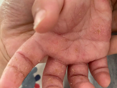 奶癣患儿手部出现大小不等的红斑,颜色略暗红,边界不清,在红斑的基础上可见少量痂皮,瘙痒明显,患儿经常不自觉搔抓局部,出现脱皮现象。