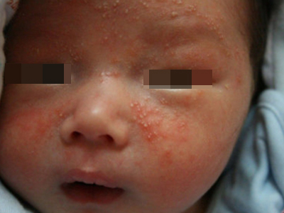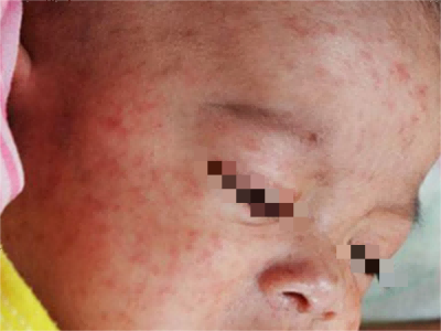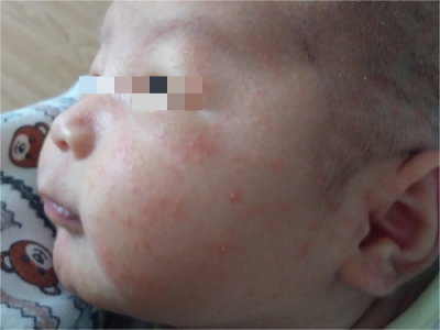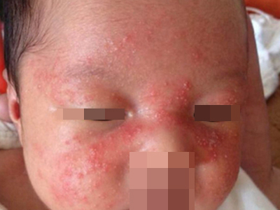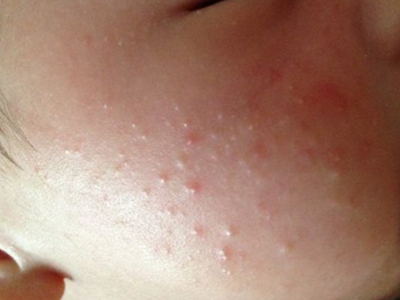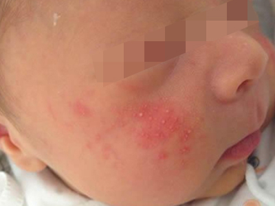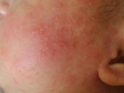 奶癣患儿左侧脸颊上出现密密麻麻的红色小疙瘩和小水疱,像粟米一样大,顶端尖或圆,疱液呈米黄色,皮疹之间有淡红色斑片,皮损向耳朵和颈部蔓延。