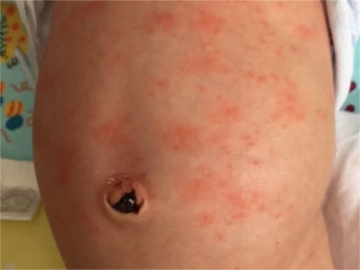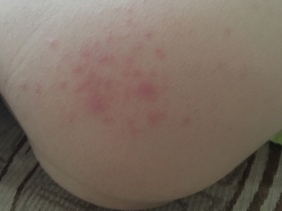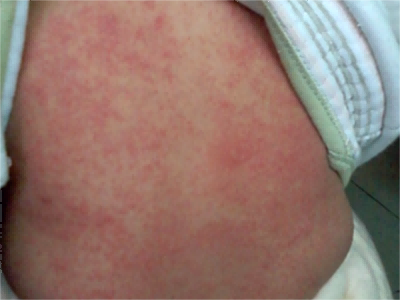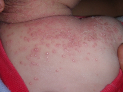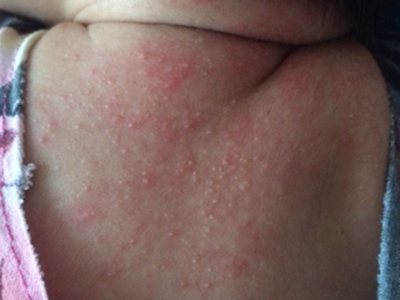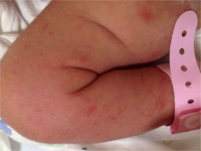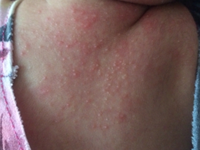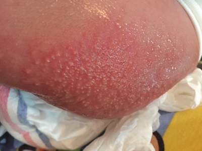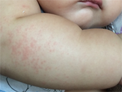 奶癣患儿初发时胳膊上红红的,出现瘙痒性红斑,继而在其基础上出现针尖大小的丘疹,密集分布,边界不清,部分皮损间发生融合,患者自觉局部瘙痒感明显。