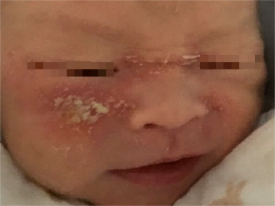 奶癣皮损为片状红斑,见于右眼下及眉间部位,红斑表面覆有白色的糠状鳞屑及脱皮,皮肤干燥无明显渗出。由于局部剧烈瘙痒,患儿常异常烦躁,有哭闹表现。