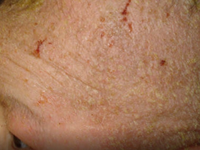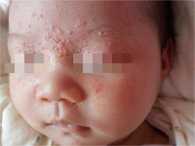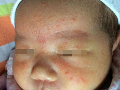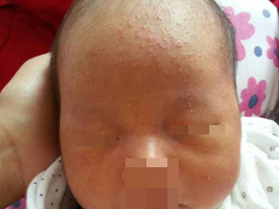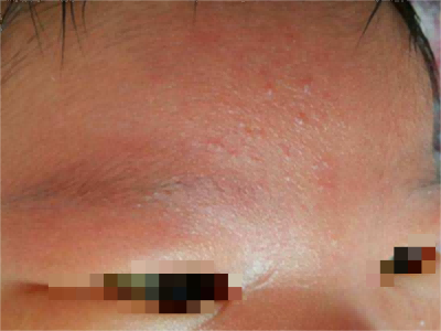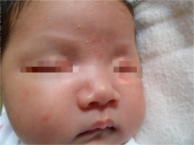 奶癣皮损分布在前额可见局部有高出皮肤的丘疹小颗粒,群集和散在分布,呈丘疹状,约针尖大,色红,周围伴有红晕。继发感染后导致化脓,顶端见白色脓点。