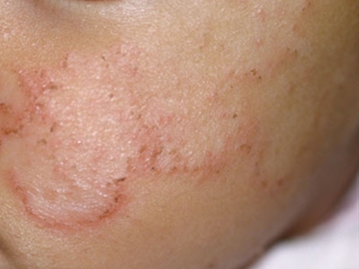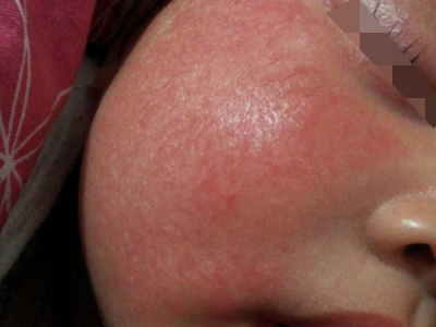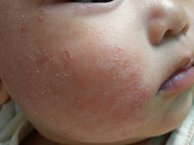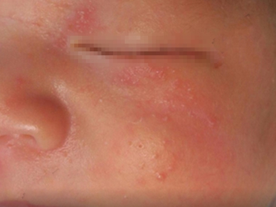 奶癣发生于左脸颊部可见有瘙痒性红斑,红斑呈大片状,其表面出现芝麻大小的丘疹、丘疱疹,顶端呈黄白色,数目众多,群集分布,有时皮损向下颌部、颈部蔓延。