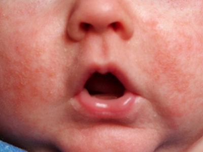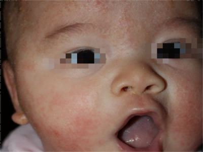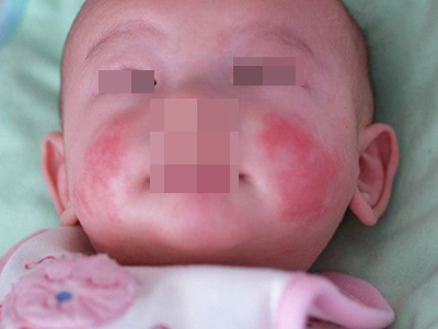 奶癣患儿两侧面颊和下巴发生弥漫性鲜红色斑,伴有小水疱和群集分布的扁平小丘疹。在红斑的基础上还有细小裂纹,裂口呈赤红色,是由于局部皮疹瘙痒抓挠后导致,创口处有液体渗出,结蜜黄色的痂。