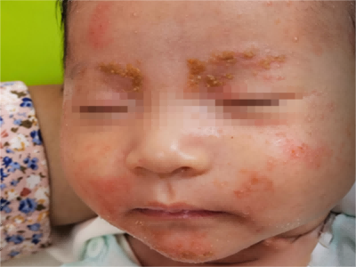 奶癣患儿自觉局部皮损瘙痒剧烈,反复摩擦、抓挠后导致渗出、结痂,额头上出现密集分布的黄色痂皮,表面粗糙,并伴有微小裂口,呈红色,少量红黄色浆液渗出。
