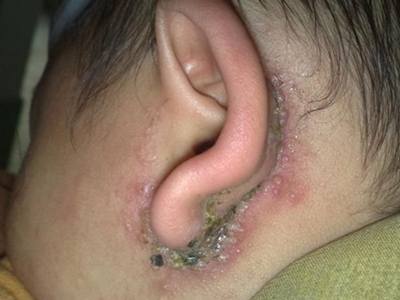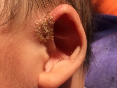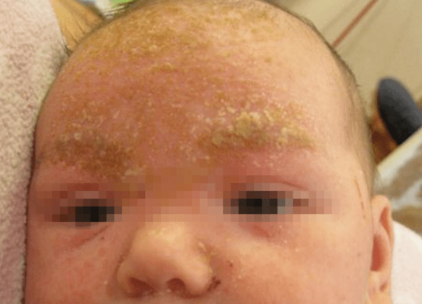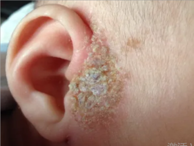 奶癣皮损大部分会发生在头皮部位,局部皮肤表面形成脓痂,呈黄色,表面略薄,呈纸片样改变,基底皮肤发红,边界不清,搔抓或摩擦局部会出现脱屑现象。