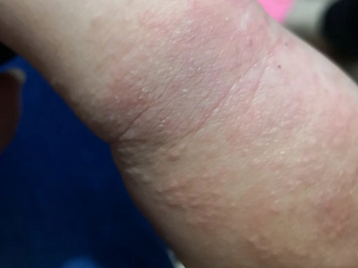 奶癣病变部位有时会出现在胳膊,表现为皮肤表面发红,面积较大,在其表面有许多小疙瘩,呈针尖至粟粒大小,密集分布,形状不规则,边界不清,患者自觉局部瘙痒明显,经常不自觉搔抓。