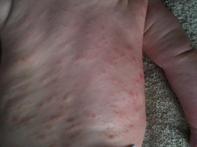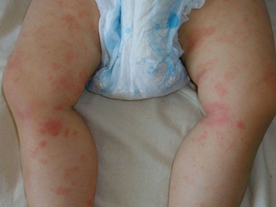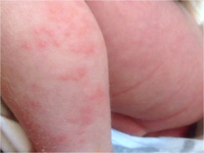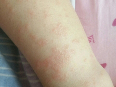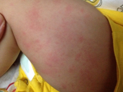 奶癣患儿胳膊上出现多个红斑,呈块状分布,略隆起于皮肤表面,边界不清,部分皮损表民出现大小不等的小疙瘩,皮损可迅速扩展至其他部位。