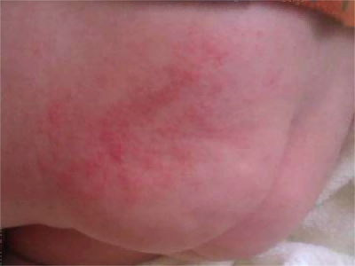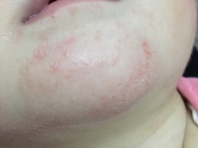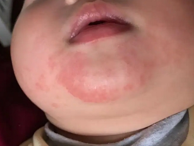 奶癣患儿初期下巴处可见有针尖大红点,相邻红点相互融合形成片状红斑红斑,斑片形状不规则,边界不明显,分布无规律,伴有瘙痒症状。