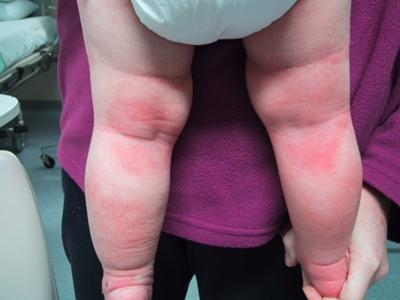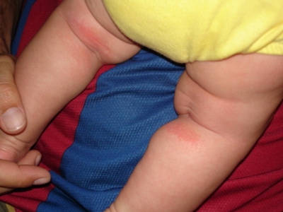 奶癣皮损泛发至四肢可见患儿双腿腘窝附近出现红斑,边界不清,右腿有散在分布的小丘疹,皮损表面无渗出、糜烂。患儿因局部瘙痒,常有反复踢腿或异常哭闹的现象。