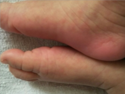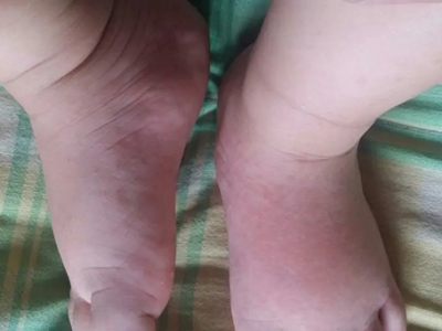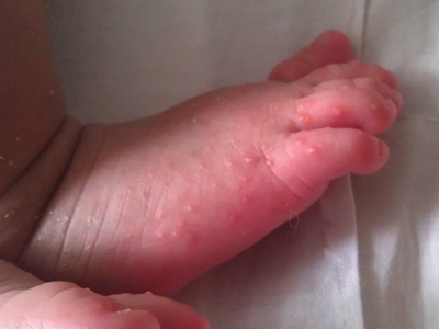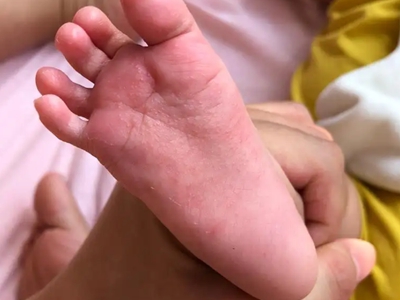奶癣有时会发生在脚上,局部皮肤表面出现潮红,分布面积较大,呈弥漫性,与周围正常皮肤无明显的界限,患儿自觉瘙痒,局部可见条状抓痕。