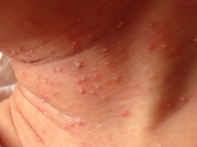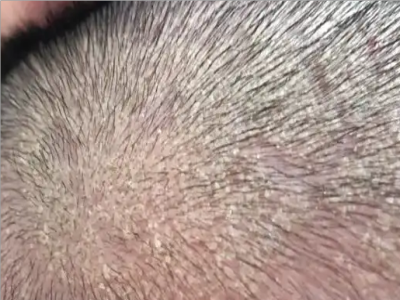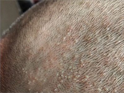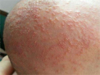 奶癣发生于头部时头皮上有密集分布的小红疙瘩,呈丘形,为针尖大小,顶部呈尖形或圆形,表面伴有少量白色鳞屑。症状严重者,波及整个头皮。