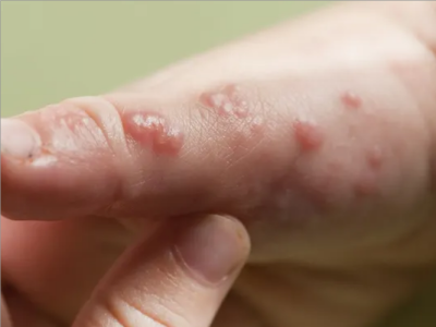 奶癣皮损表现为局部皮肤表面发红、光亮,并伴有轻微肿胀,病变发生在手部,甚至逐渐扩展到手腕处,部分红斑基础上出现丘疹、丘疱疹、结痂等症状表现。
