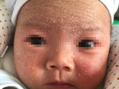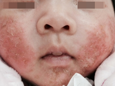 奶癣皮损为对称性分布的红斑,逐渐出现丘疹、丘疱疹、水疱,常因搔抓摩擦导致水疱破损,干涸后形成黄黑色痂,分布在婴儿两颊和下巴部位,同时还伴有细小裂纹,皮肤表面干燥、粗糙。