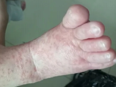 奶癣有时可发生在脚底部,局部皮肤表面红肿,症状较轻,在其基础上可见针尖大小的丘疹,密集分布,且与周围正常皮肤无明显的界限,搔抓局部可出现脱屑现象。