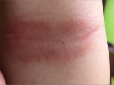 奶癣有时会发生在胳膊上,患儿局部皮肤表面出现红斑,呈条状分布,颜色略暗红,边界不清,部分红斑表面有少许黄色鳞屑,经摩擦后易于脱落。