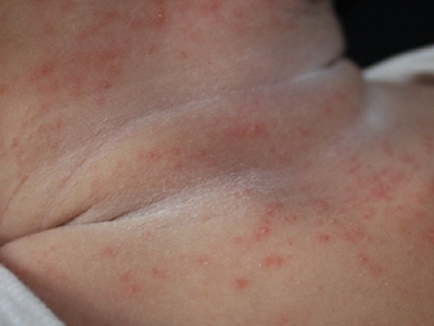 奶癣大部分会发生在头部,皮损表现为局部出现小丘疹,呈红色,表面光亮,密集分布,皮疹间相互不融合,其顶端带尖,患儿自觉有瘙痒感,经常不自觉搔抓。