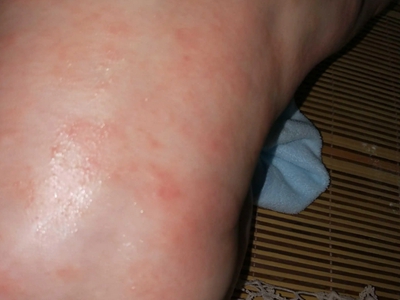 奶癣患儿脚上出现许多小红疙瘩,看起来像小红点样改变,略突出于皮肤表面,在其周围有边界不清的红斑,其形状不规则,患者自觉局部有瘙痒感。