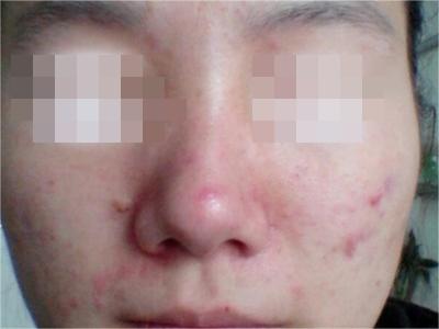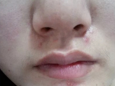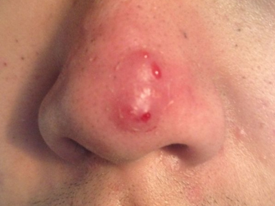 颜面疖痈发生于鼻子上,肉眼见有一个圆形的疙瘩,颜色发红,黄豆大小,其顶部有红色皮损面,并且有流水现象。患者有疼痛感,但痛感较轻。