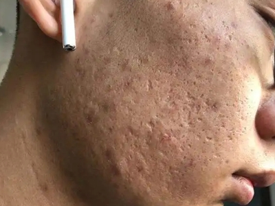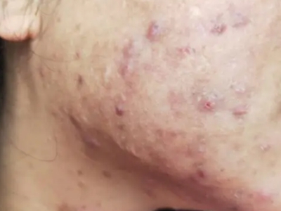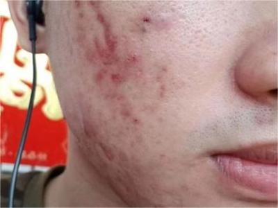 颜面疖痈痊愈后,在之前皮损的部位出现很多坑,形态不规则,呈针孔至米粒大小,略低于皮肤表面,呈现皮色,同时有数个散在分布的小包,没有其他不适感。