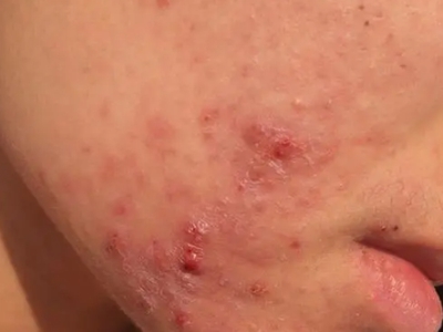 颜面疖痈症状严重时,表现为下巴上鼓起一个大红疙瘩,约鹌鹑蛋大小,中间有鲜红色糜烂面,并有黄色液体渗出,按压有疼痛感,多与面部卫生不佳、擦伤有关,导致金黄色葡萄球菌感染。
