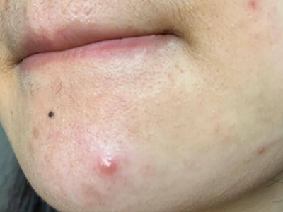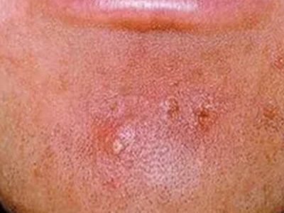 下巴发生颜面疖痈时,皮损表现为单发的小红疙瘩,边界清楚,粟粒大小,颜色暗红,顶端冒白色脓头,可用手挤压出脓栓,局部皮肤发白紧致,伴随疼痛感。