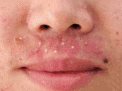 颜面疖痈形患者面部有许多小红疙瘩,呈散在分布,微微隆起于皮面,疙瘩周围有红晕,境界不清,触碰有疼痛感,随疙瘩变大,表面会出现白色的脓点。