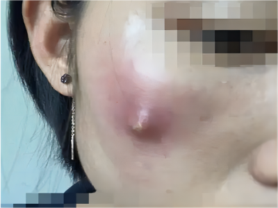 颜面疖痈表现为患者右侧脸颊出现一个暗红色脓包,周围皮肤发红肿胀,皮损顶端见一个白色的凸出点,脓头破溃排出脓栓,此后症状缓解,病情逐渐痊愈。
