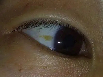睑裂斑白眼球处有不规则的黄色斑块图