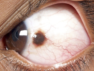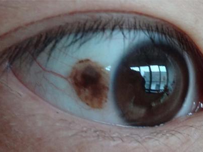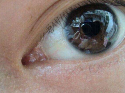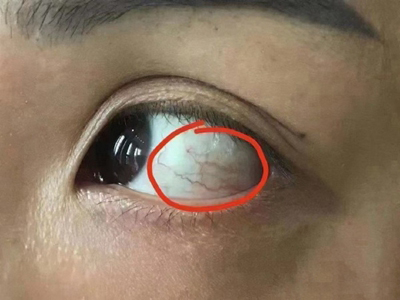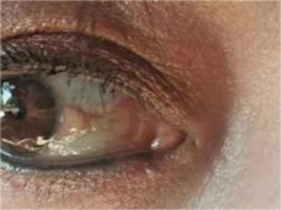 睑裂斑患者白眼球处有一个小疙瘩,如绿豆大小,颜色呈红褐色,中间颜色深,周围颜色相对浅,形状呈圆形凸起,高出眼球表面,眼球上有红血丝与其相连。