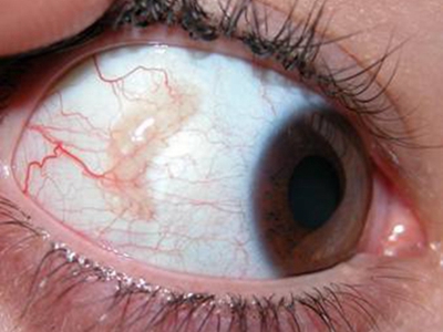 睑裂斑患者白眼球处出现半透明状斑块,颜色呈淡黄色,表面光滑无破损,紧紧贴敷在结膜之上,无自觉症状,病变通常静止,极少侵犯角膜。