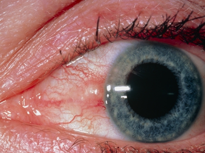 睑裂斑症状严重时表现为白眼球出现淡红色隆起斑块,边缘相对不清晰,同时局部结膜因充血而布满血丝,颜色深浅不一,呈弯曲状,患者伴有眼睛发痒等自觉症状。