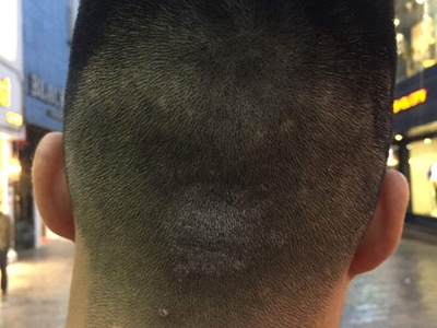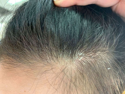 患有头皮糠疹患者头皮出现一片白色脱屑,形状不规则,周围头皮因抓挠略微泛红。患者用手轻触白色脱屑后,出现小片状脱落,并伴有轻度瘙痒。