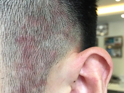 头皮糠疹患者左侧耳周头皮出现红斑,形状不规则,表面有细小的头皮屑附着,主要是头皮瘙痒搔抓导致。部分红斑突出于皮肤表面,用手触摸会有疼痛感。