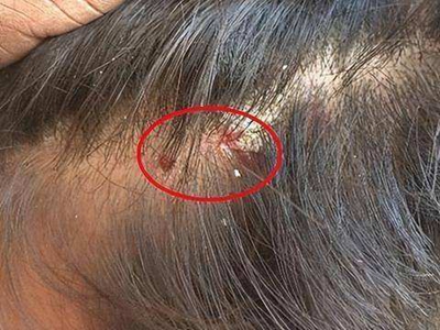 头皮糠疹患者头皮表面出现两个疙瘩,顶部出现破损,周围绕有一圈红晕,用手触摸疙瘩会感到轻微疼痛,多由头皮瘙痒患者搔抓引起。