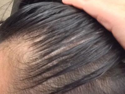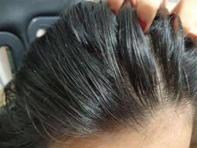 头皮糠疹患者出现少量脱发,导致头发不能完全覆盖在头皮表面,患者绑头发时会露出下方头皮,同时头皮和头发多脂,头发较为油腻。