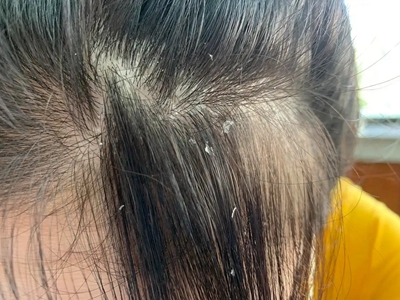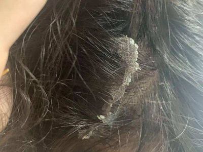 头皮糠疹患者头皮出现大块头皮屑,部分头皮屑未完全脱落,附着在发根处与头皮相连。患者用手轻扣后,头皮屑会随之掉落,进而露出正常头皮。