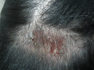 头皮糠疹患者头皮因瘙痒抓挠出现一个不规则形状破损,在其中间出现红色破溃面,伴有渗血、渗液以及轻微的疼痛感,之后皮损结痂。