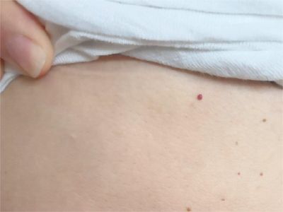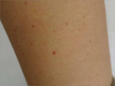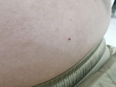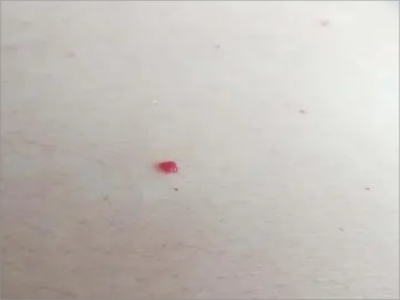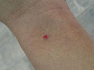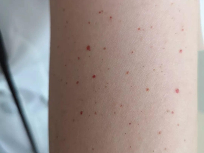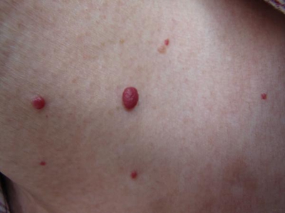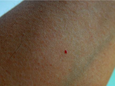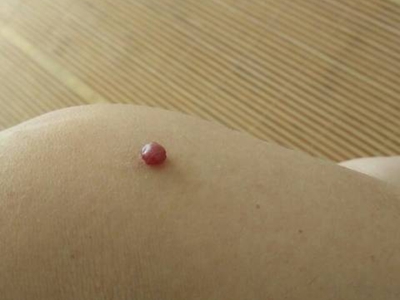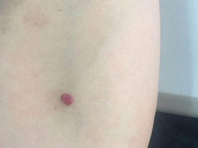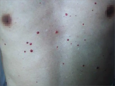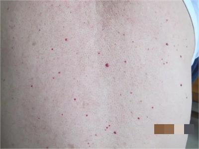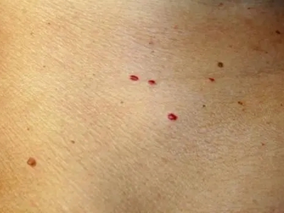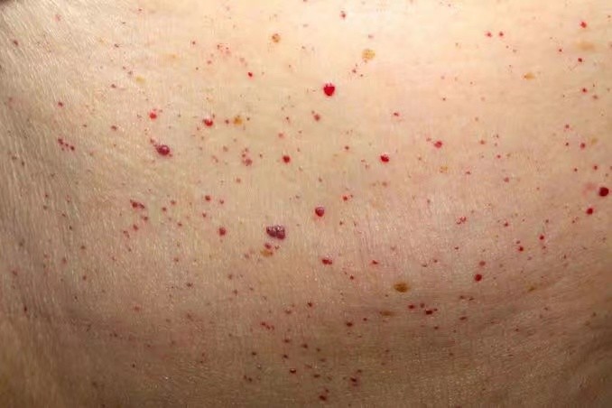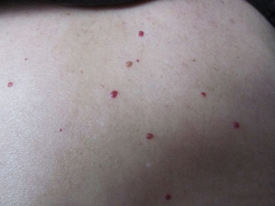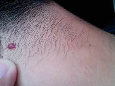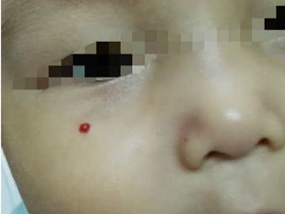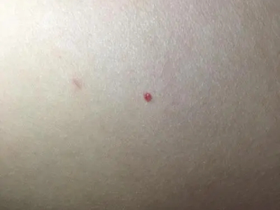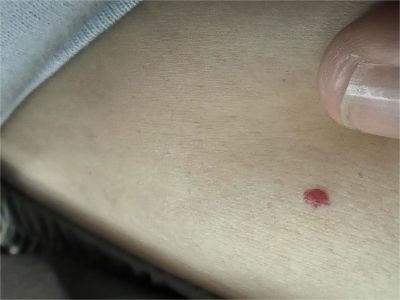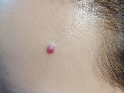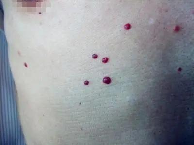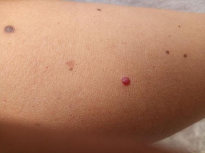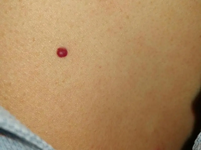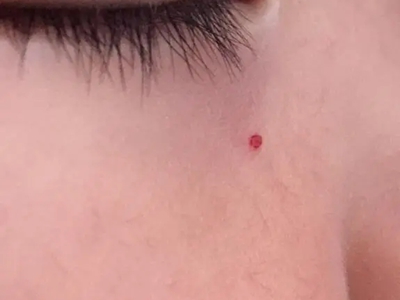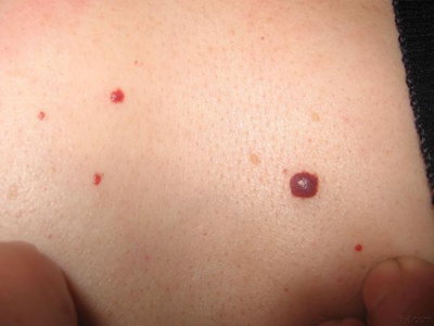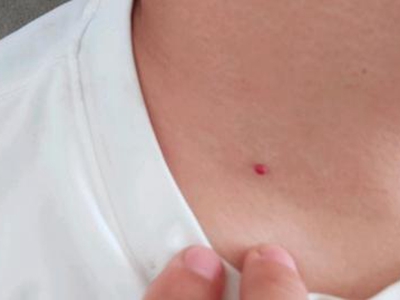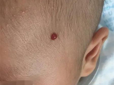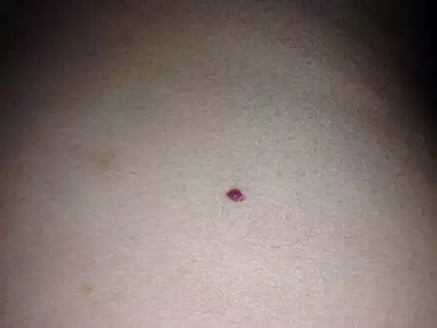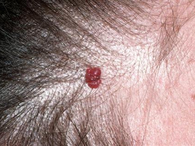 樱桃状血管瘤病变发生于头部,单发,表现为高起于皮面的凸起,呈半球形,樱桃色。瘤体直径约为5mm,质软。患者多无自觉症状,一般无需治疗。