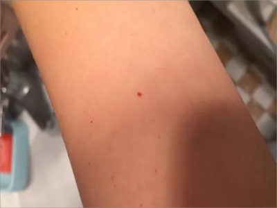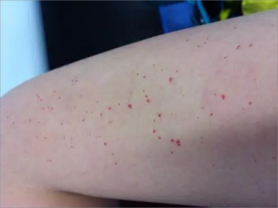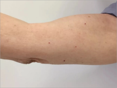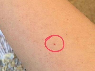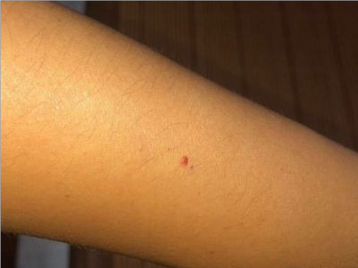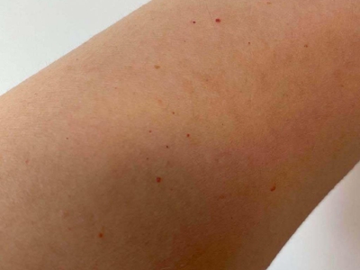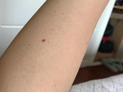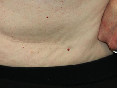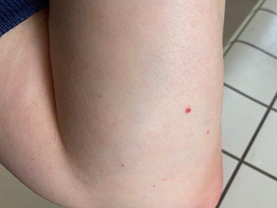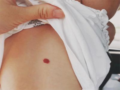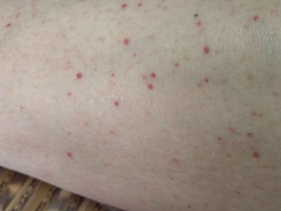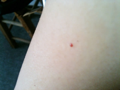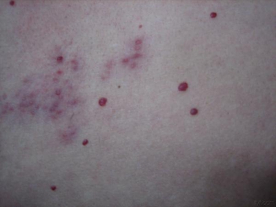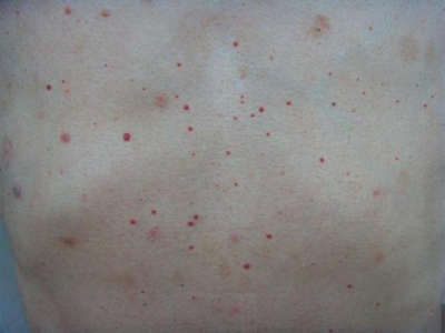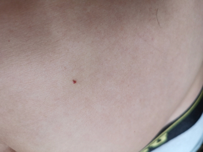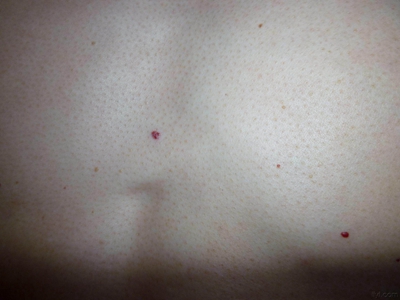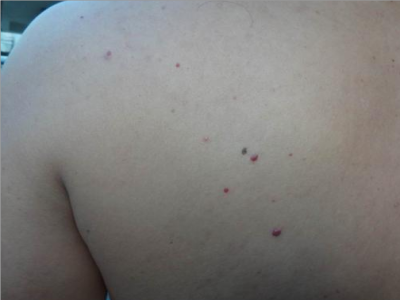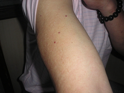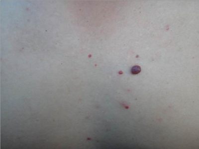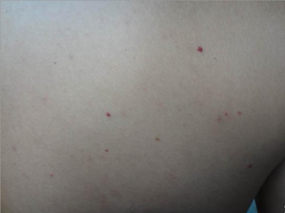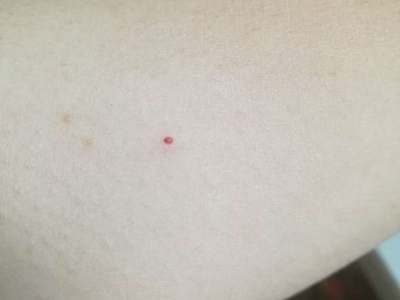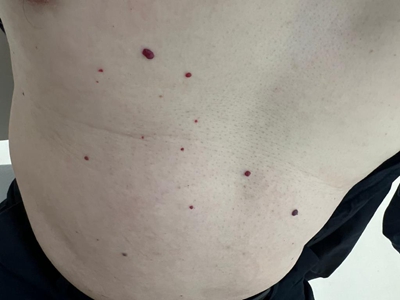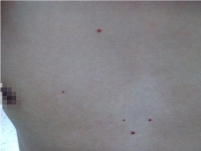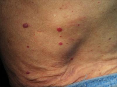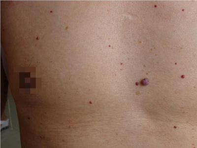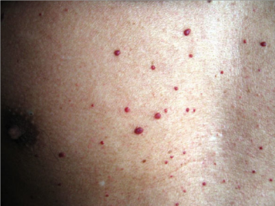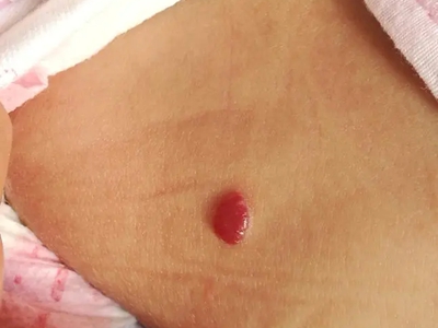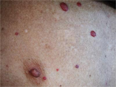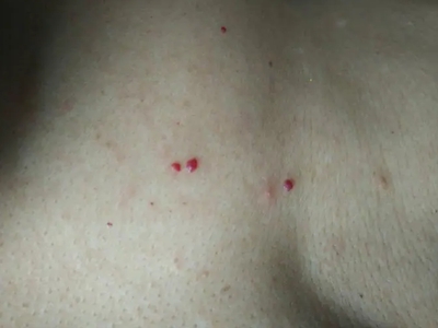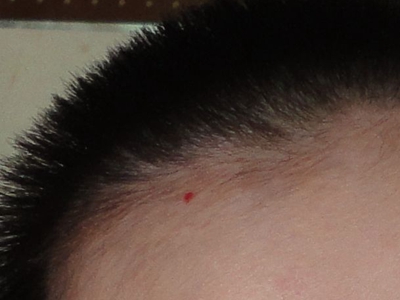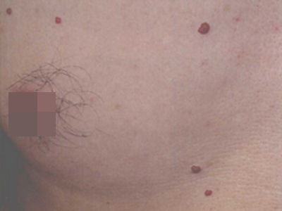 樱桃状血管瘤病变发生于头部,单发,表现为高起于皮面的凸起,呈半球形,樱桃色。瘤体直径约为5mm,质软。患者多无自觉症状,一般无需治疗。