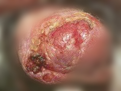 龟头癌的患者在龟头部位可观察到边界清楚的红色疙瘩突起,中间有溃疡、脓性或血性分泌物,伴有恶臭味,肿瘤继续发展可侵犯整个阴茎海绵体和尿道海绵体。