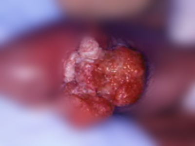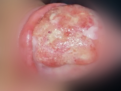 龟头癌主要在阴茎头和包皮内板,病变开始为丘疹或湿疹样改变,而后形成溃疡,肿瘤增大融合,表面溃破有脓性分泌物、恶臭。晚期肿瘤可突出包皮口或穿破包皮呈菜花样。肿瘤继续发展可侵犯整个阴茎海绵体和尿道海绵体。