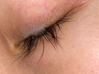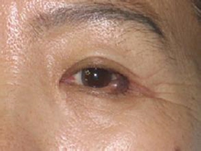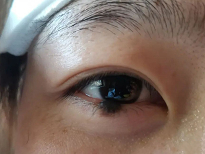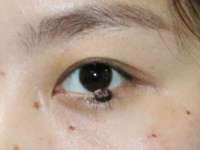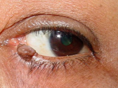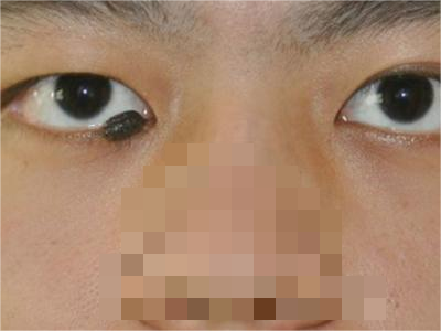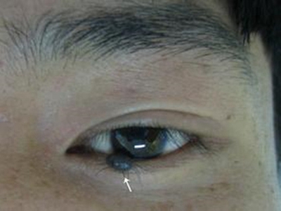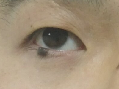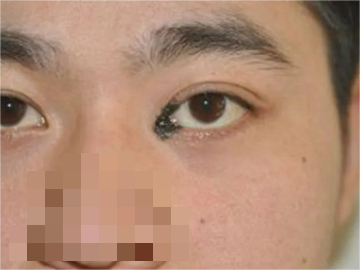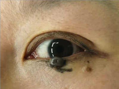 眼睑皮内痣患者下眼睑靠近内眼角区域可以看到一个黑色大疙瘩,如绿豆大小,呈椭圆形,上面附着一些眼睫毛,表面光滑,可影响患者视野。