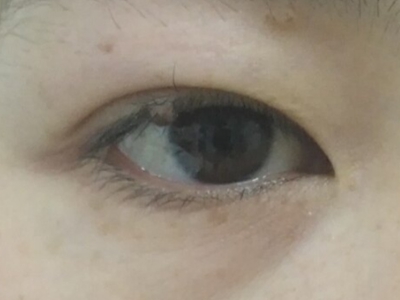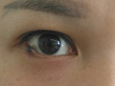眼睑皮内痣在上眼皮的眼缘上可以看到一个蓝黑色的突起,如豌豆大小,呈椭圆形,表面光滑,上面有眼睫毛正常生长,边界清晰,边缘整齐。