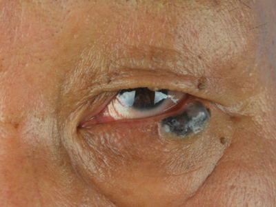 眼睑皮内痣表现为棕黑色的肿物,单独发生,形状不规则,边缘不整齐,但与周围正常皮肤分界明显,表面粗糙,约豌豆大小,见于左侧下眼睑。