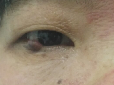 眼睑皮内痣患者的下眼睑有一个大疙瘩,颜色为黑褐色,呈红豆大小,表面发亮,上有睫毛生长,不伴有疼痛、瘙痒等自觉症状,但是患者的视野会受到影响。