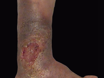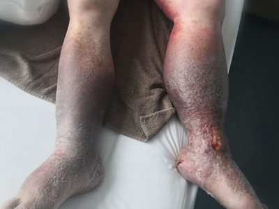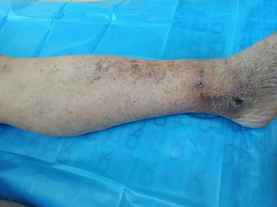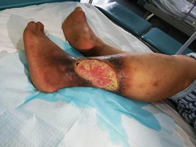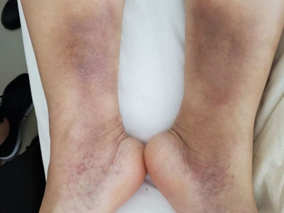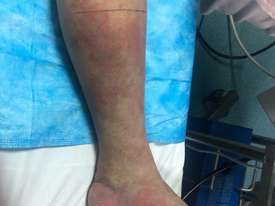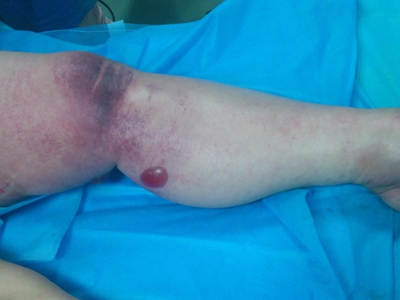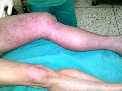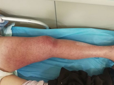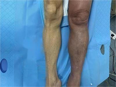 4、股青肿:通常起病急骤,患肢高度肿胀,皮肤紧张发亮、发绀,出现张力性水疱,疼痛剧烈,动脉痉挛收缩,可致足背动脉搏动消失、皮温下降;
