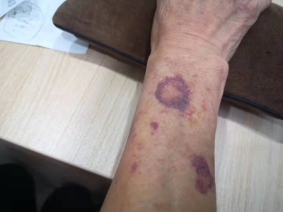 老年性紫癜胳膊皮肤干燥有一大块紫色斑图