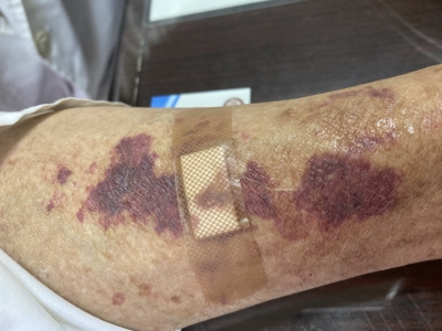 老年性紫癜胳膊出现紫红色大块瘀斑图
