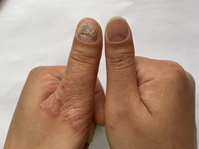 鳞屑角化型手癣患者大拇指与食指指缝皮肤明显增厚、粗糙,皮肤纹路加深,局部皮肤出现块状脱落,露出浅粉色正常皮肤,并伴有瘙痒、灼痛等不适感。